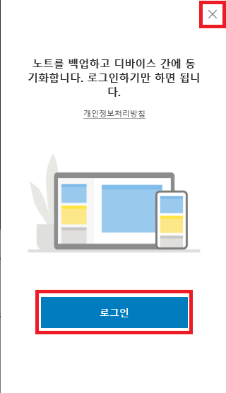 5. "로그인" 버튼 클릭 : 마이크로소프트에 로그인해서 스티커메모 동기화 기능을 사용