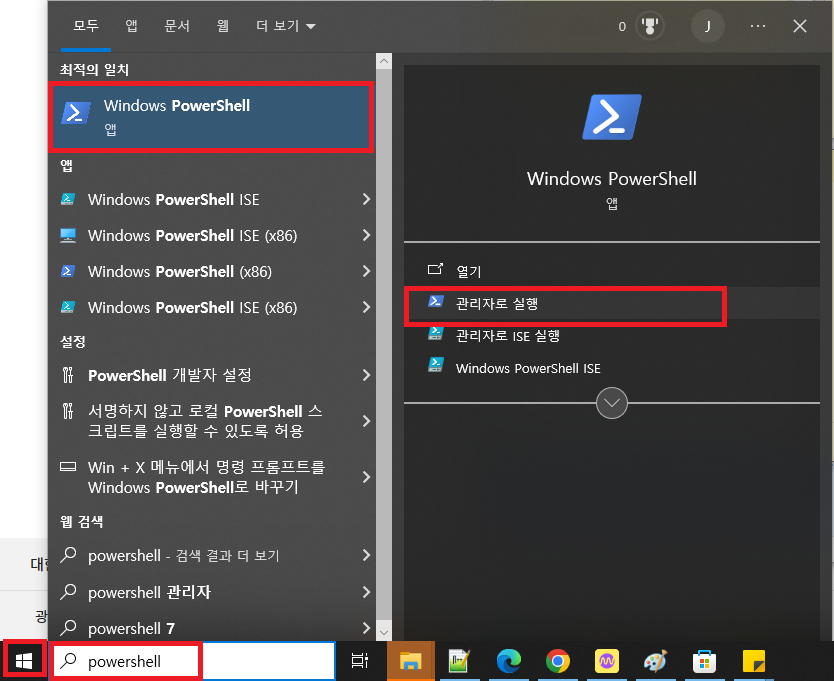 1. 시작 > "powershell" 입력 > Windows PowerShell "관리자로 실행" 클릭