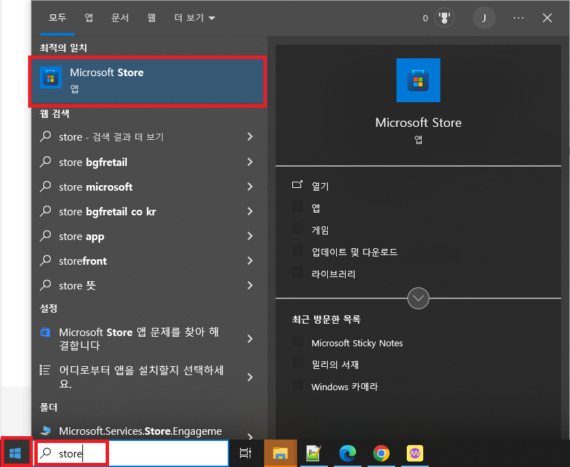 1. 시작 > "store" 검색 입력 > Microsoft Store 열기