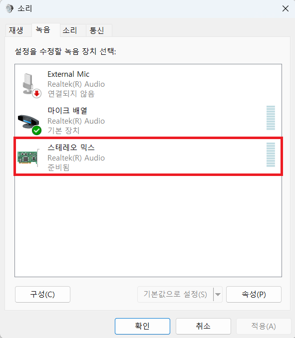 이제 컴퓨터 PC 내부소리를 녹음할 수 있는 마이크 설정이 끝났습니다!