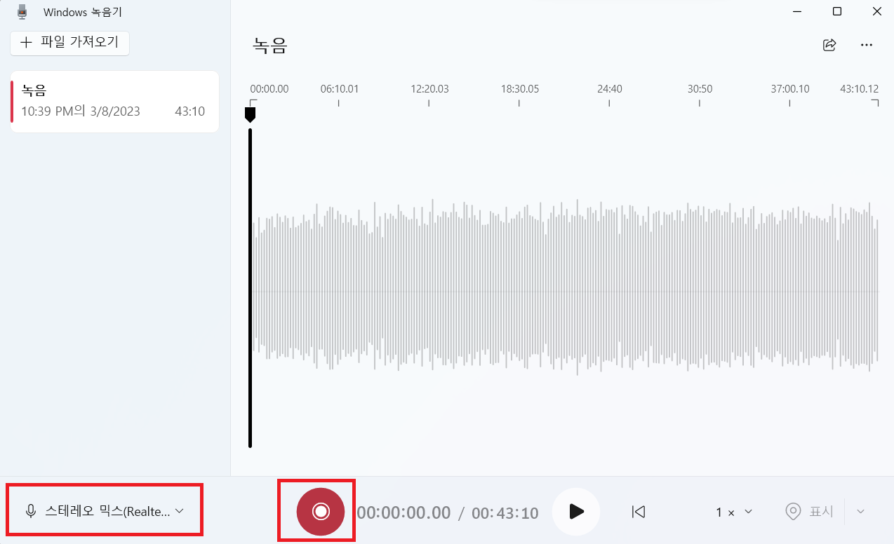 4) 좌측 하단 [스테레오 믹스]로 변경된 것 확인 후 "빨간 녹음버튼" 클릭하여 녹음합니다.